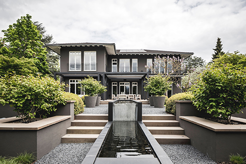 De eigenaren van een villa in een voormalig Duitse kuuroord benaderden Wolterinck voor een ontwerp waarin de bijzondere Italiaanse architectuur van hun woonhuis werd verbonden met de omliggende natuur. Door de hoge ligging van het huis in het bosrijke Taunusgebergte kijken de bewoners vanuit hun woonkamer uit over een sprookjesachtige vallei vol dennenbomen. De ontwerpers van Wolterinck brachten een subtiele, maar krachtige zonering aan. Rondom het huis gelden de principes van de klassieke tuinarchitectuur, zoals strakke lijnen en symmetrie. Naarmate je verder de tuin in wandelt krijgen natuurlijke vormen en landschappelijke beplantingen meer en meer de overhand. Cruciaal zijn de krentenbomen in het midden van de tuin. Ze zijn weliswaar strak gegroepeerd, maar door hun weelderige verschijning vormen zij een geleidelijke overgang van tuin naar landschap en van architectuur naar natuur – precies zoals de bewoners wilden.