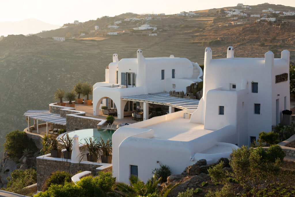 Voor hun vakantiehuis op een Grieks eiland verlangden de eigenaren een inrichting die recht doet aan het mediterrane, ruige heuvellandschap van het eiland. Wolterinck vertaalde dit in een ontwerp met pure en ruwe materialen, rijk aan texturen en aardse tinten. Het huis zelf, 25 jaar geleden gebouwd als pas het derde vakantiehuis op het eiland, gaf daar ook alle aanleiding toe. De vloeren zijn sober en oneffen, de natuurstenen muren organisch en grof. Wolterinck introduceerde meubels van onbewerkt hout, donkere vloerkleden en kunstwerken die door hun vormen, patronen en kleuren woest en landschappelijk aandoen. De ligging van het huis in de luwte van de rotsige helling, met zicht op de oneindige azuurblauwe zee, verleidde Wolterinck tot grote gebaren. Op het buitenterras staan keramische plantenbakken, stoere lantaarns en ruime zitelementen. Aan de wanden van het terras hangen strakke, stalen spiegels. De weerspiegeling van de lucht en de zee zorgen voor kleur, het koele buitenlicht steekt scherp af tegen de donkergrijze stenen.